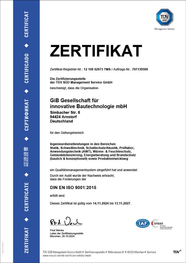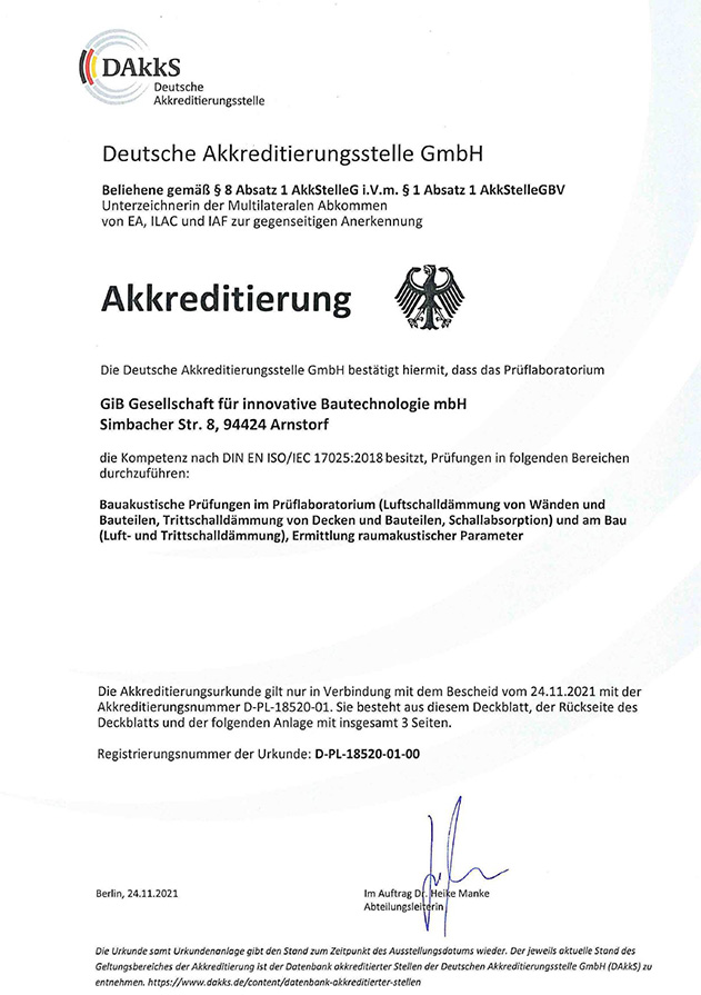 Wir haben ein Qualitätsmanagementsystem nach DIN EN ISO 9001 für den im Zertifikat angegebenen Geltungsbereich eingeführt. Das Prüflabor der GiB mbH im Bereich Akustik besitzt zusätzlich die Kompetenz nach DIN EN ISO/IEC 17025, Prüfungen nach den in der Akkreditierungsurkunde angegebenen Prüfverfahren durchzuführen. Durch regelmäßige interne wie externe Überprüfungen unseres Managementsystems stellen wir unseren Qualitätsstandard und die ständige Verbesserung unseres Systems sicher.