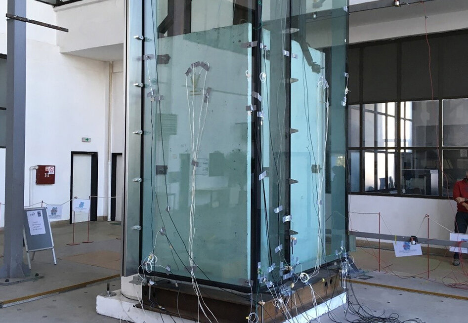 Two successful earthquake tests have already been carried out. One was for the raised floor product and the other for a façade system that was used in a project in the UK. The test structure of the façade system consisted of two all-glass elements, a corner element and a standard element, attached to a primary structure made of reinforced concrete and steel beams using standard brackets. In the lower connection, the coupling to the normally underlying elements was simulated. The two raised floor systems tested were subjected to different loads. In addition, the test systems differed in their installation height (500 mm and 1000 mm). The test superstructures were mounted in a specially manufactured steel cube, which was anchored to the so-called ‘shaking table’. To illustrate how a larger raised floor surface behaves, larger surface dimensions were tested in stages.